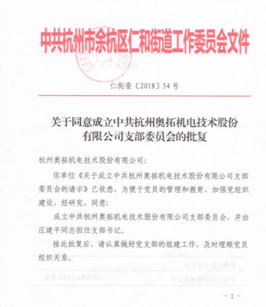近日,經(jīng)上級黨組織工作委員會審核決定,我司正式成立成立中共杭州奧拓機(jī)電技術(shù)股份有限公司支部委員會,并頒發(fā)了《關(guān)于成立中共杭州奧拓機(jī)電技術(shù)股份有限公司支部委員會的批復(fù)》。